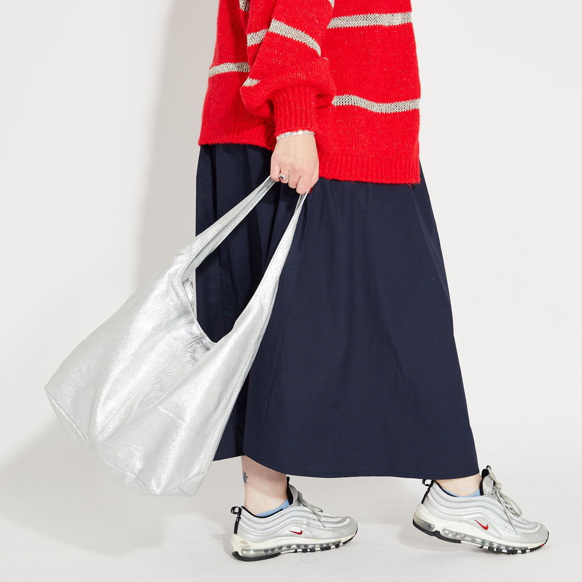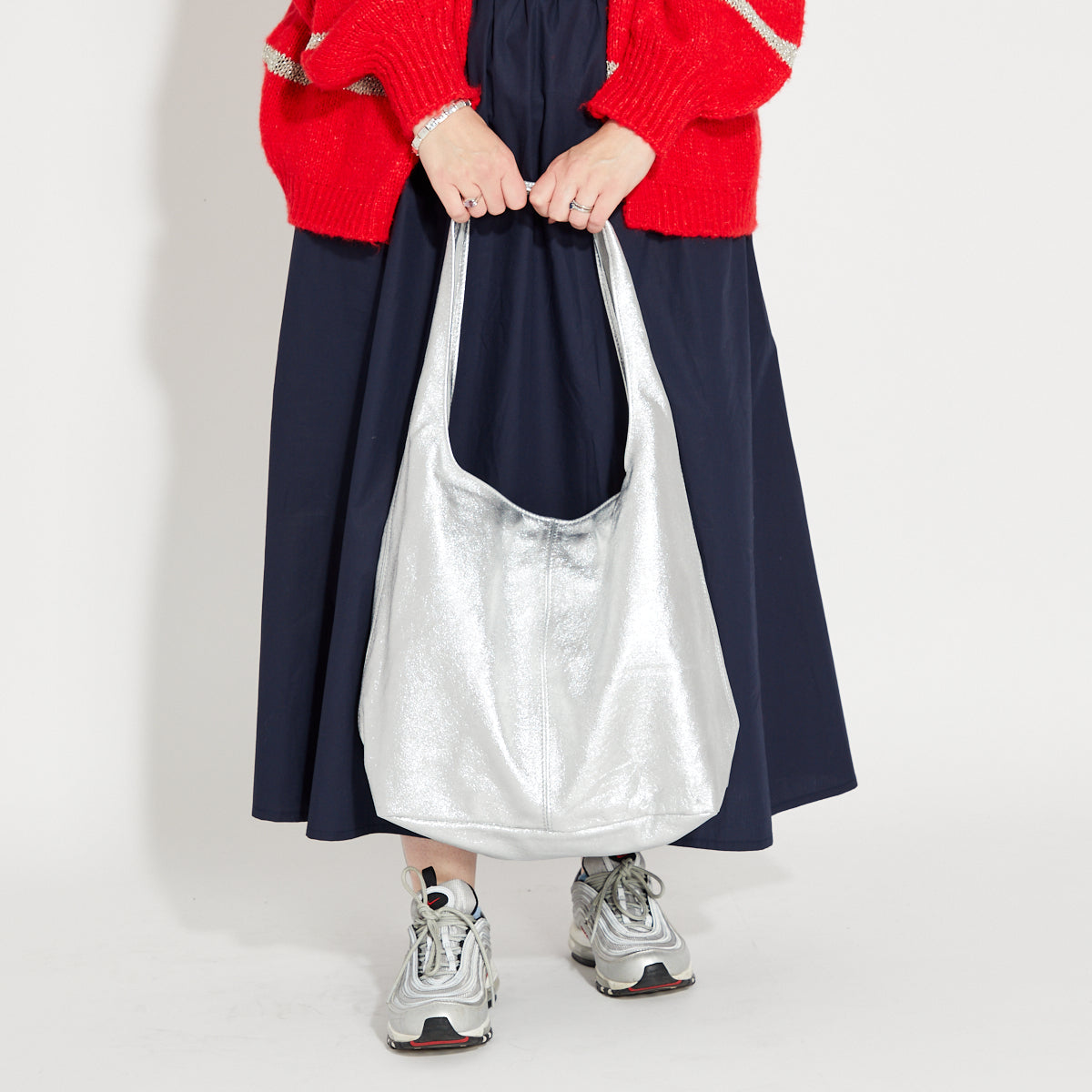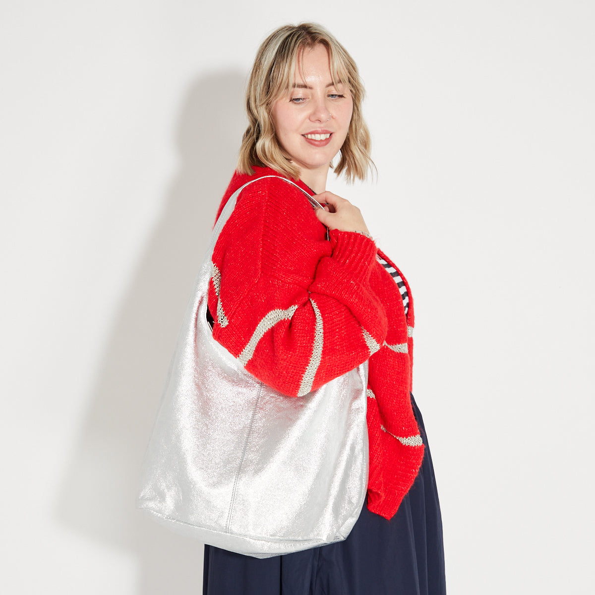 This silver leather shoulder bag features a zip fastening and spacious interior.