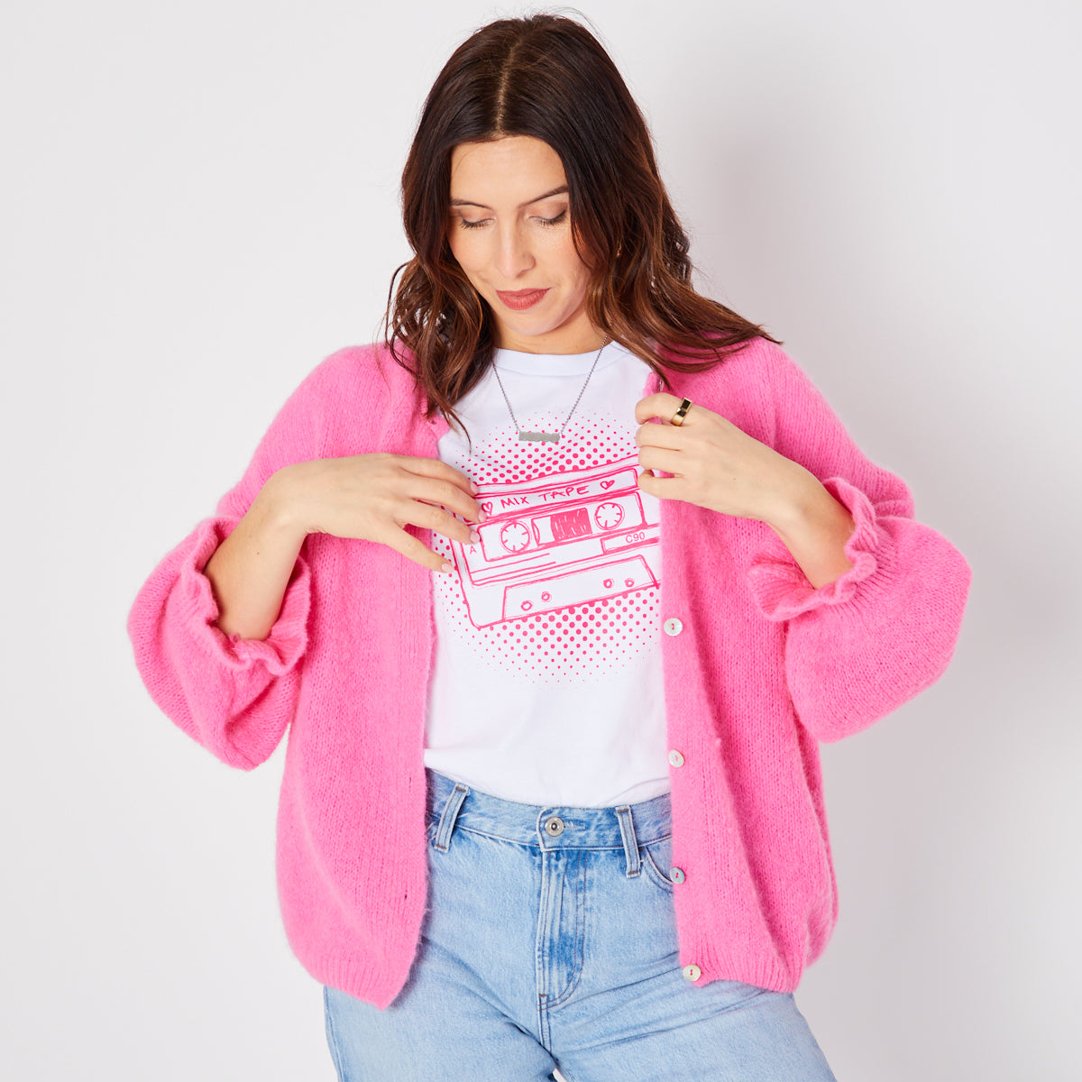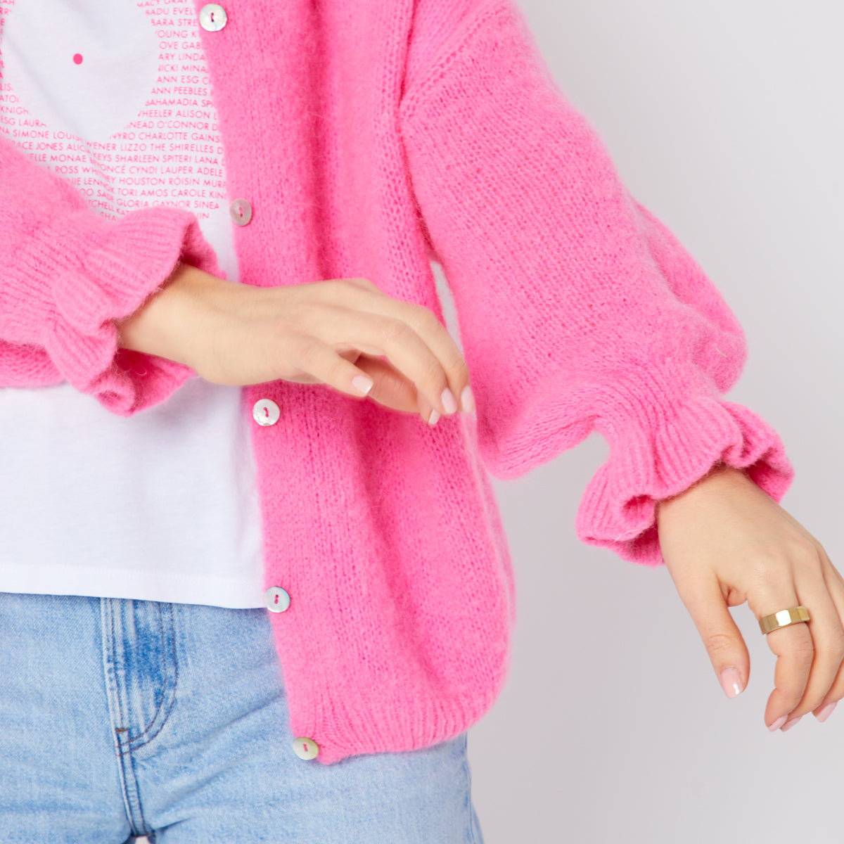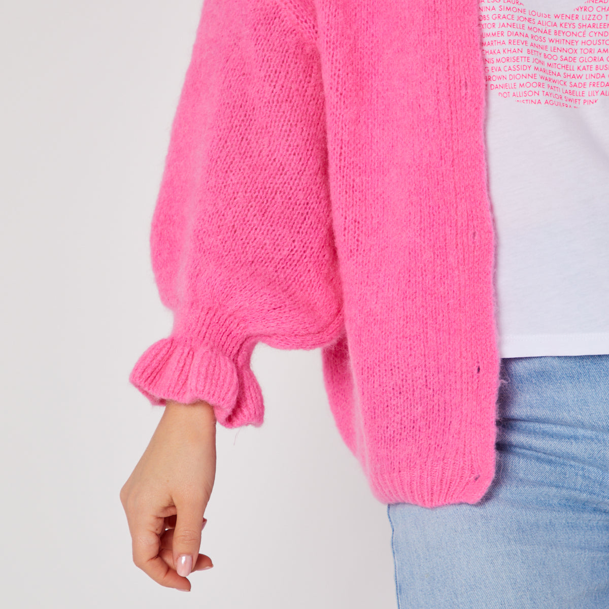 Our new pink frill sleeve cardigan is the perfect layering piece.