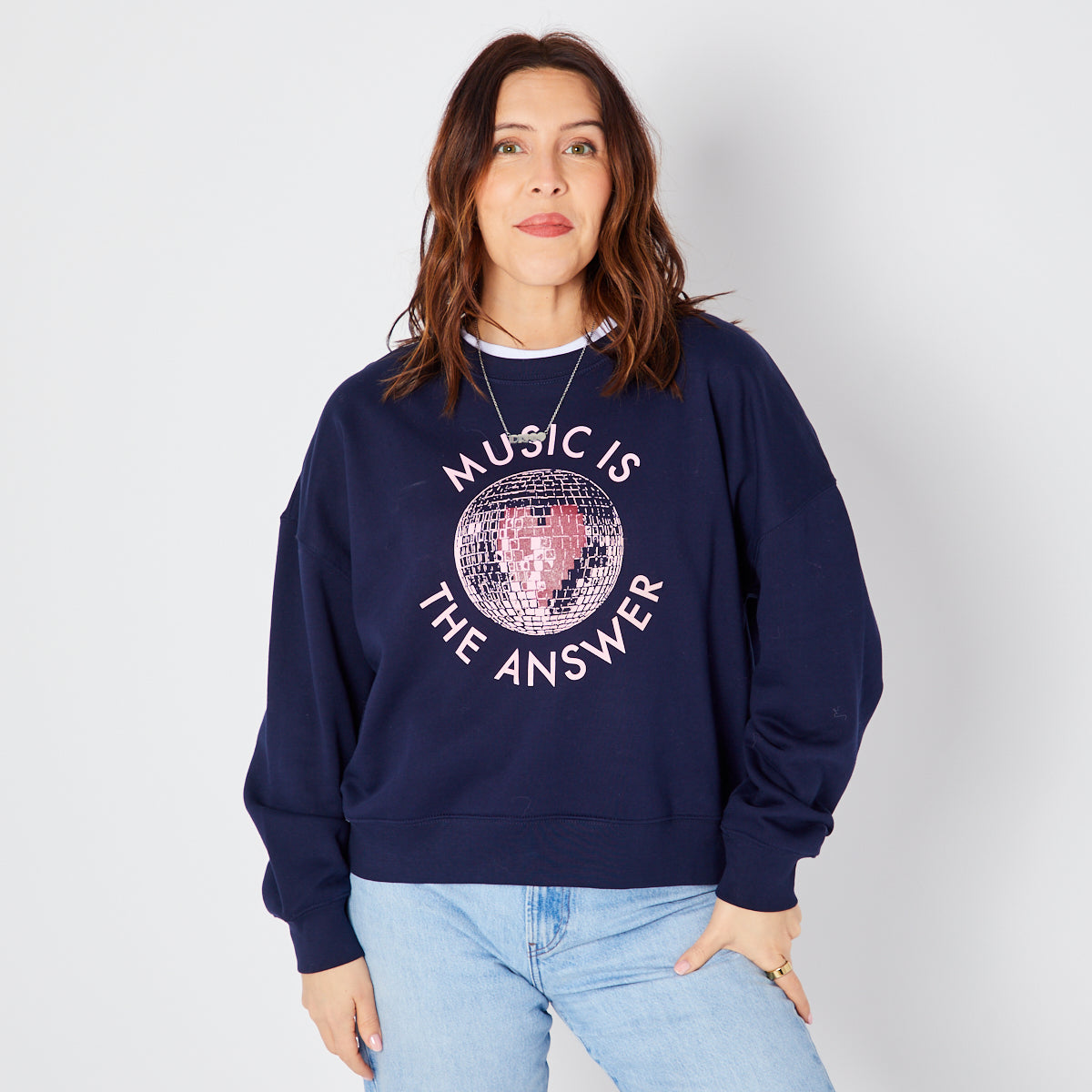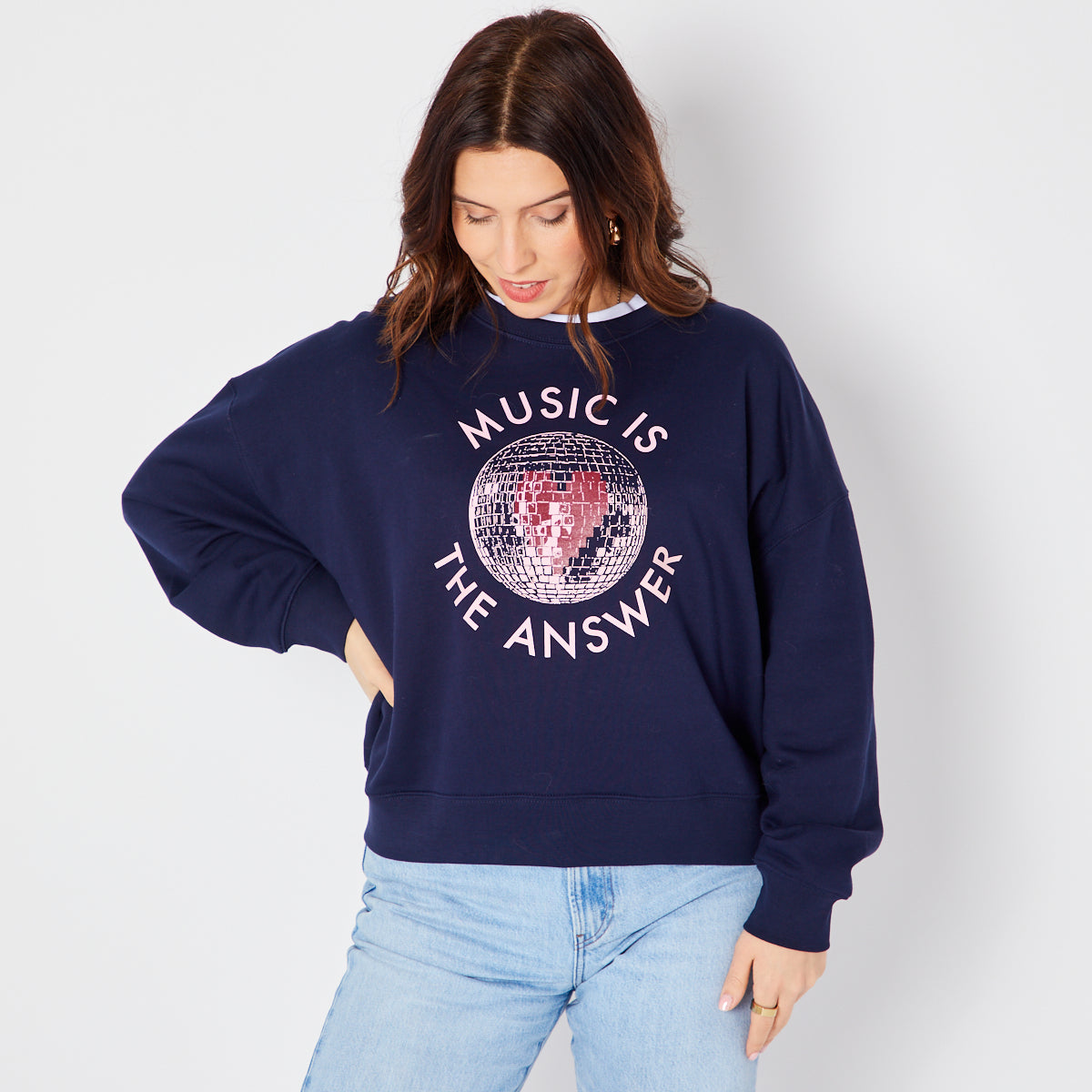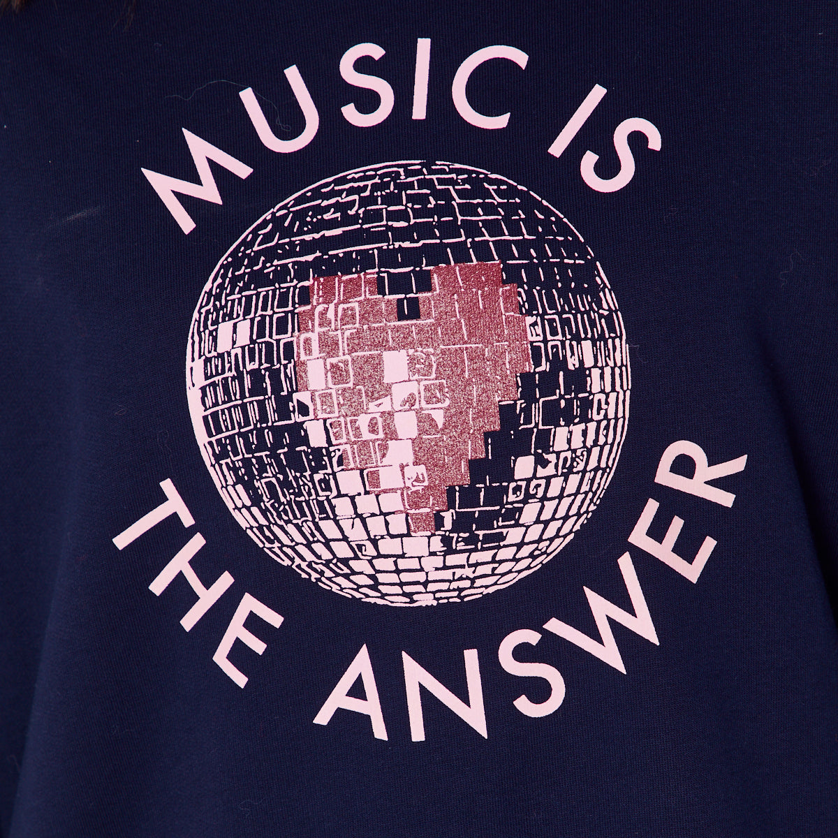 Our 'Music Is The Answer' graphic design on a navy sweatshirt.