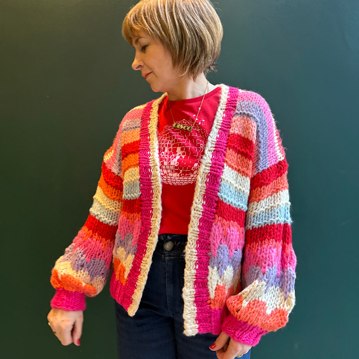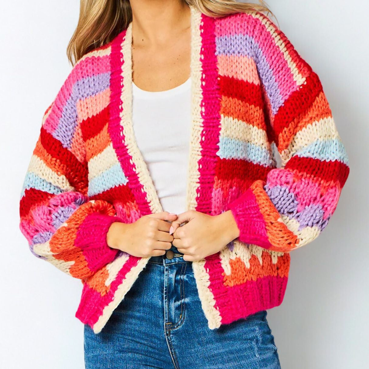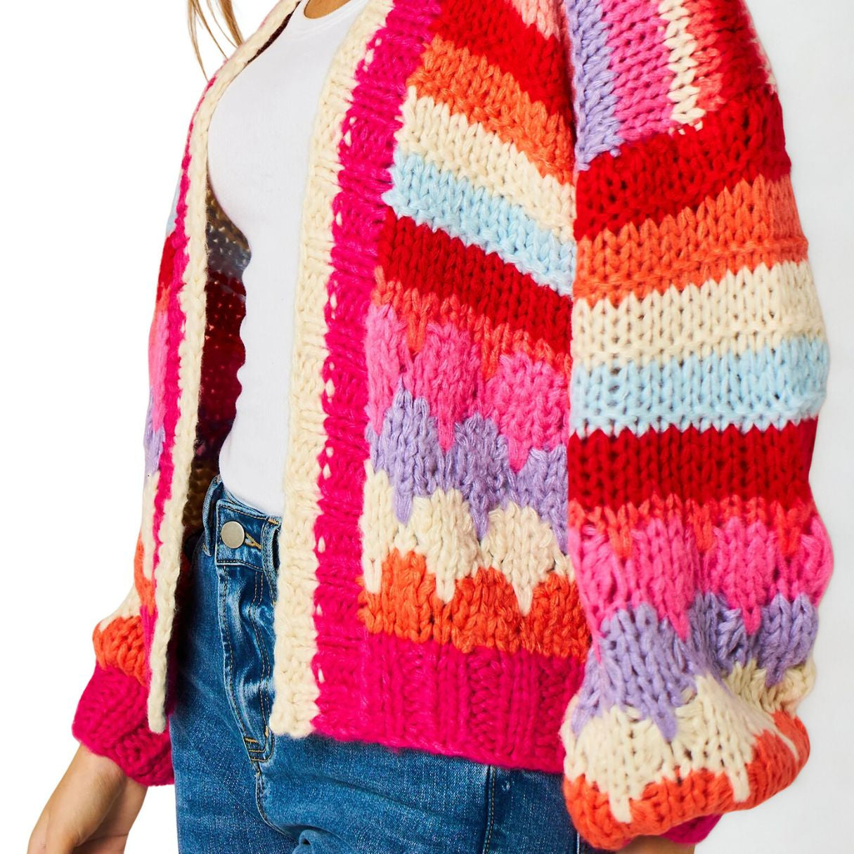 Vibrant striped hand-knitted cardigan with a relaxed fit, open front and statement balloon sleeves.