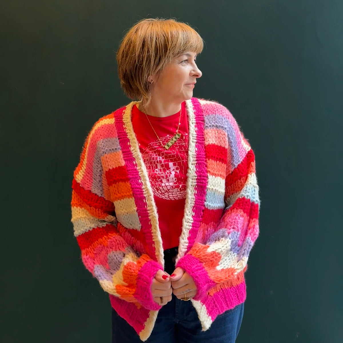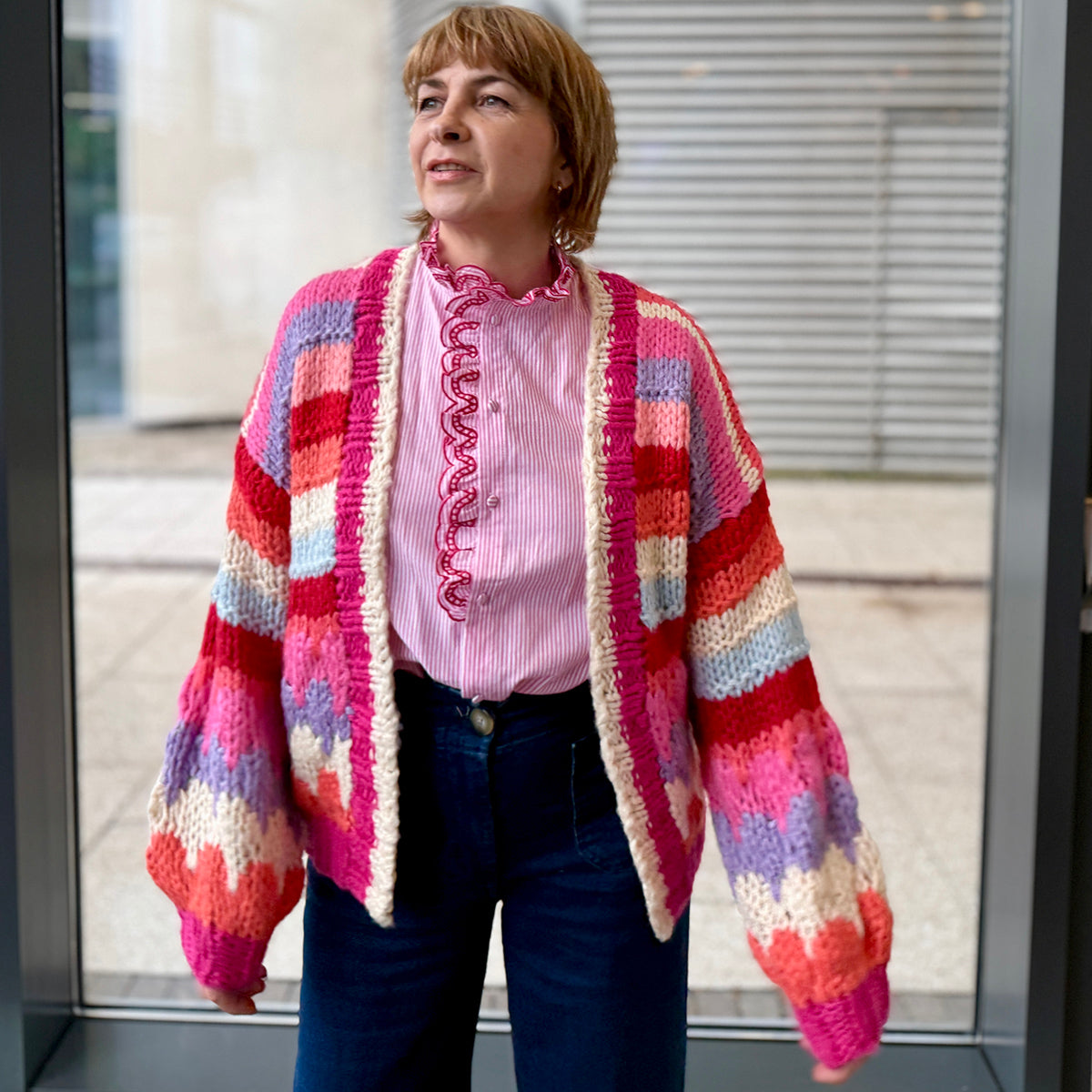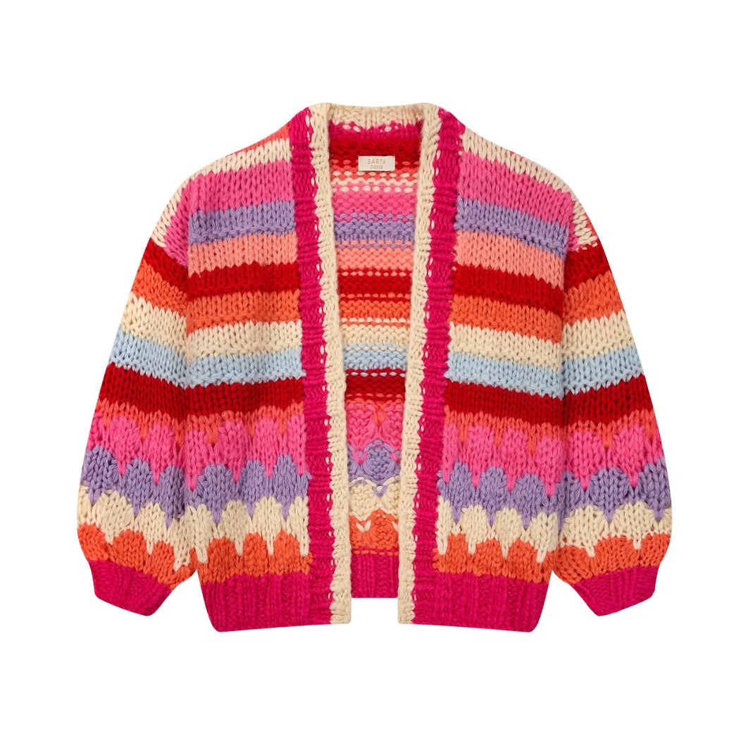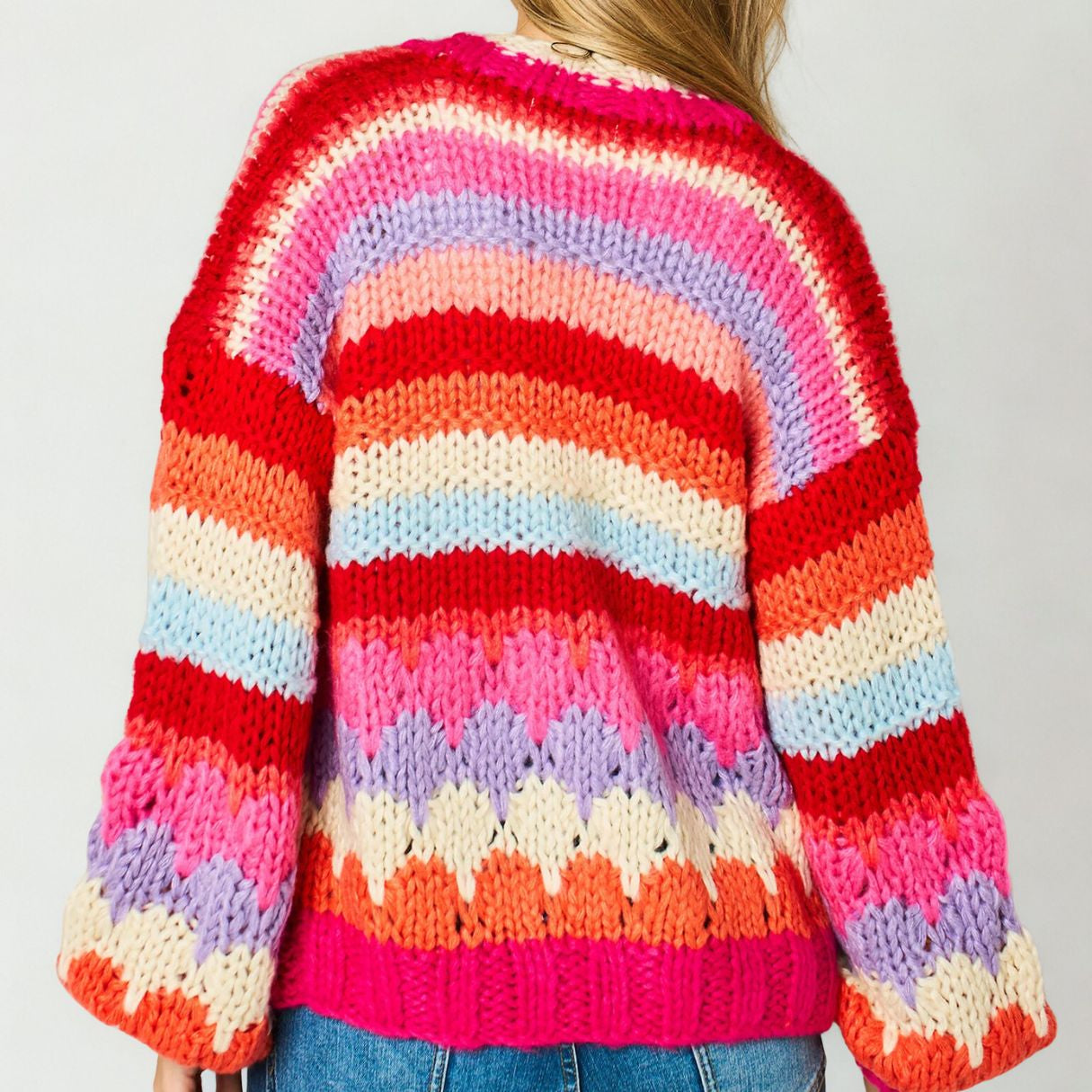 Vibrant striped hand-knitted cardigan with a relaxed fit, open front and statement balloon sleeves.
