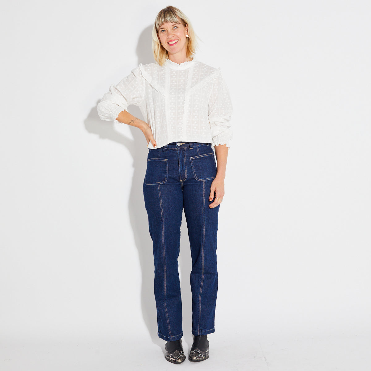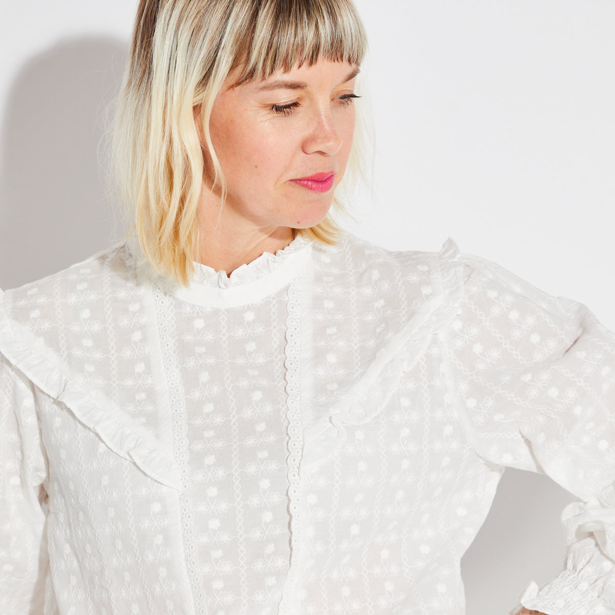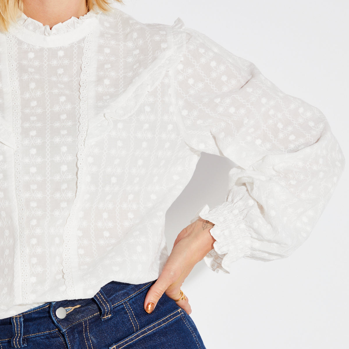 A classic white shirt from Grace & Mila, long sleeves with smocked cuffs and a round neckline with ruffles