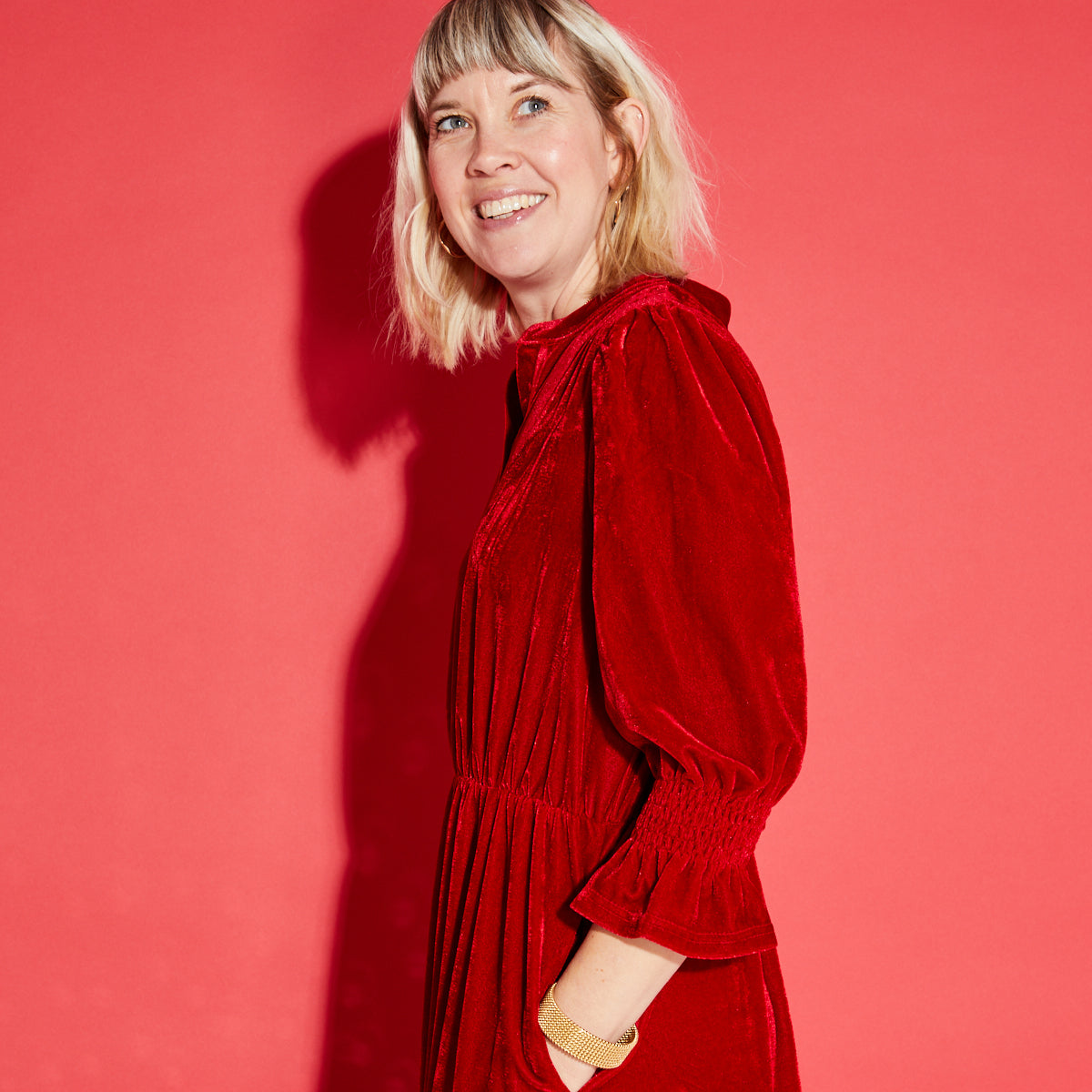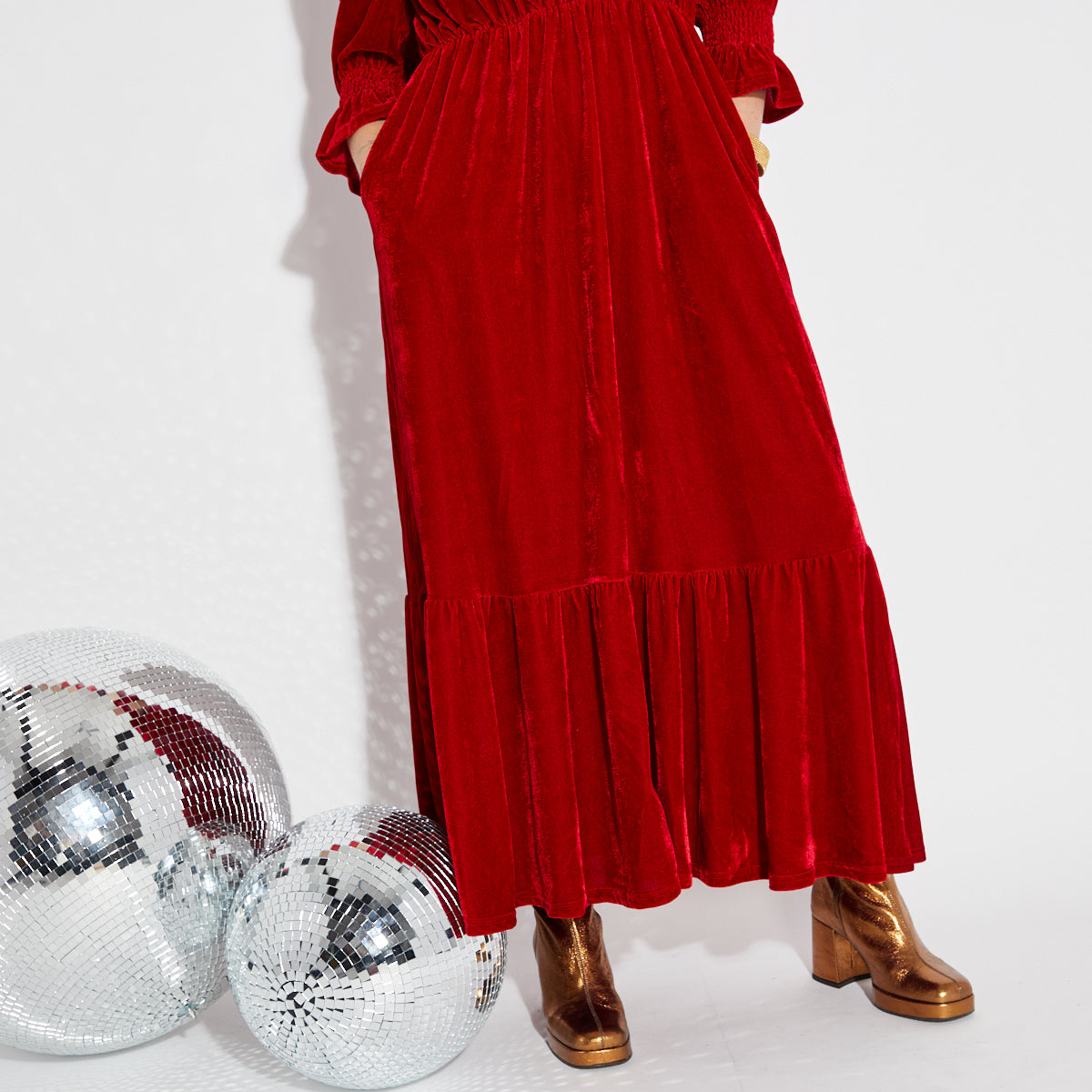 Our best selling velvet dress is back this time in a stunning red. This luxurious red dress features a small v-neck, elasticated waist, and elastic cuffs on the half sleeves.