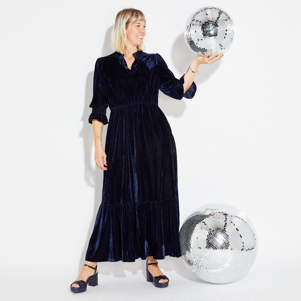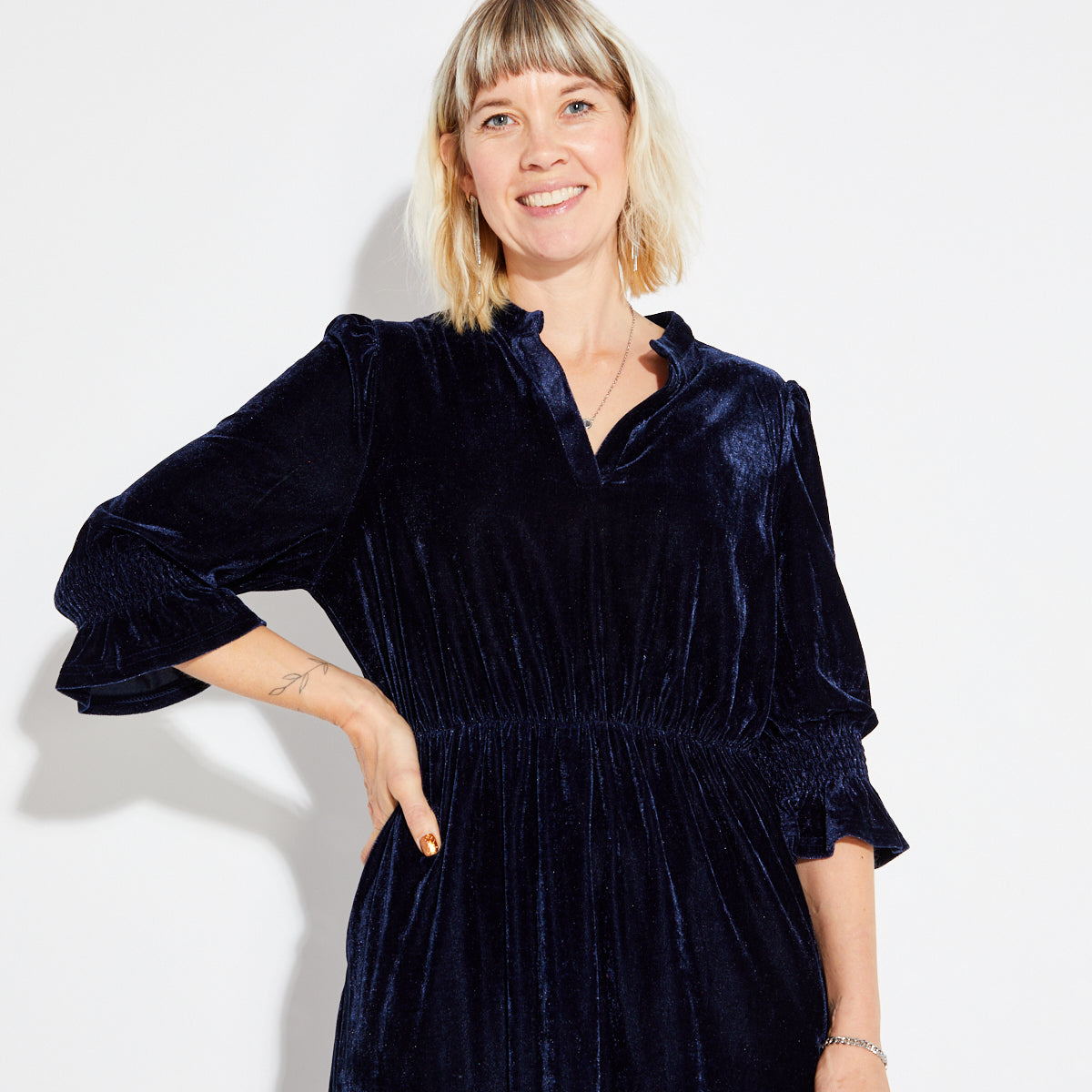 Indulge in the opulence of our Midnight Blue Velvet Dress. This luxurious blue dress features a small v-neck, elasticated waist, and elastic cuffs on the half sleeves.