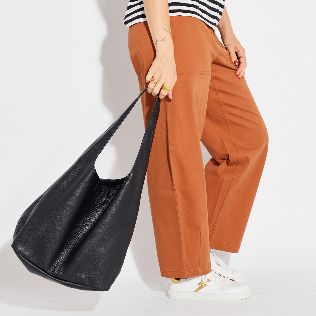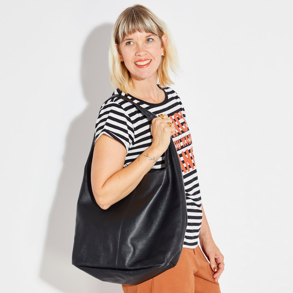 This black leather shoulder bag features a zip fastening and spacious interior.