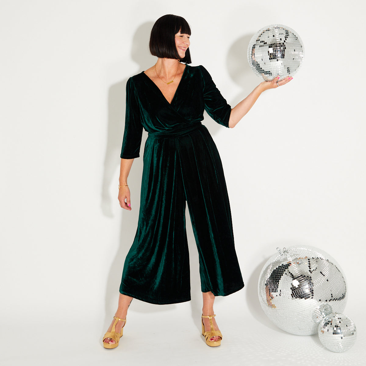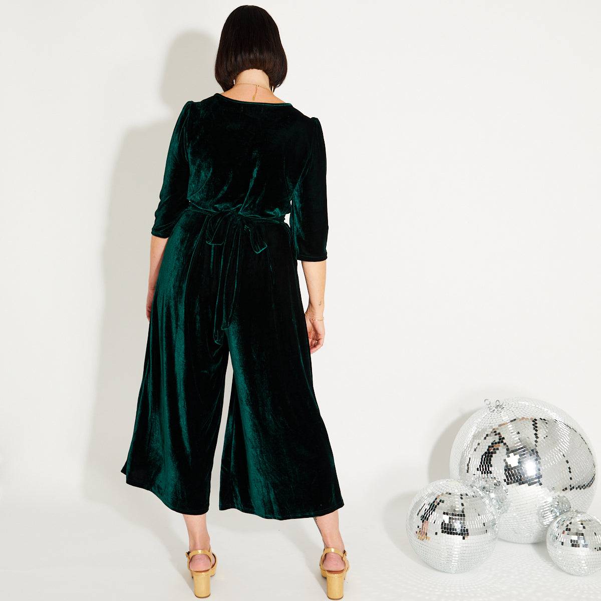 Get ready for party season with this soft, rich green velvet jumpsuit.