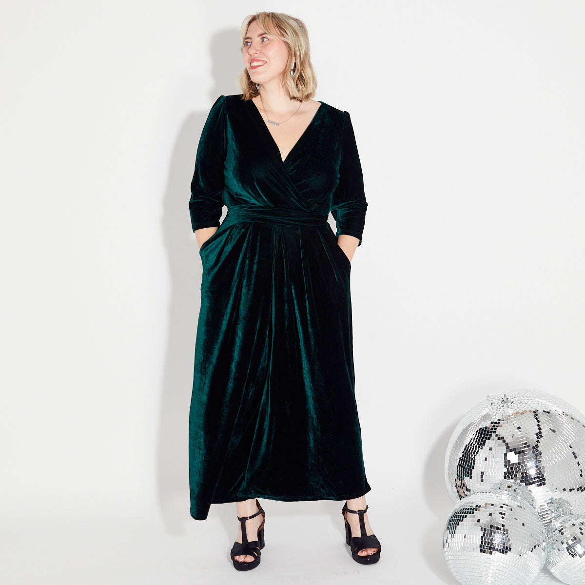 Made from super comfortable pull-on stretch fabric and featuring a V-neck, wrap waist & pockets. Perfect for Christmas parties & Winter events.