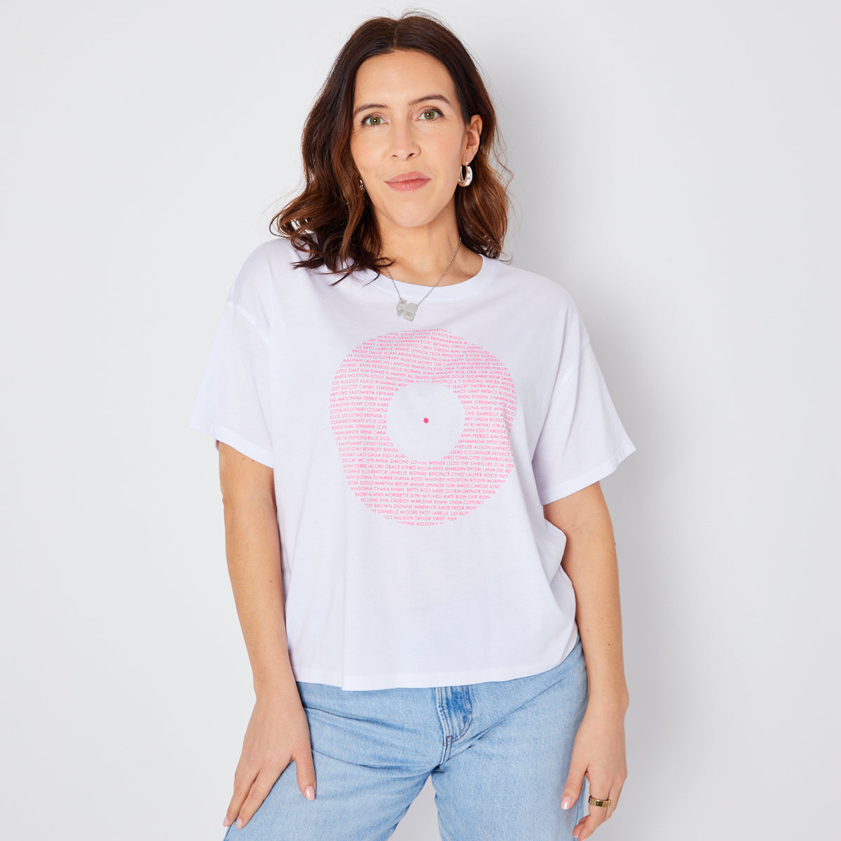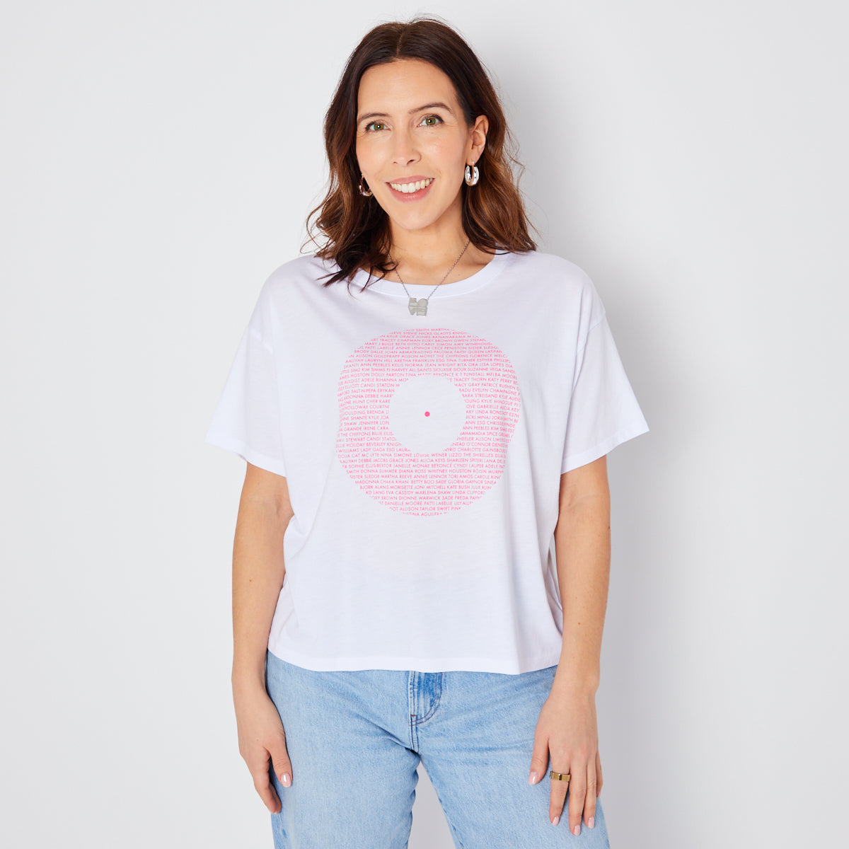 Available in sizes 8 – 18, these T-shirts have a relaxed fit with a curved high-low hem and are screen printed with a bright pink ink locally by our printer Tom.