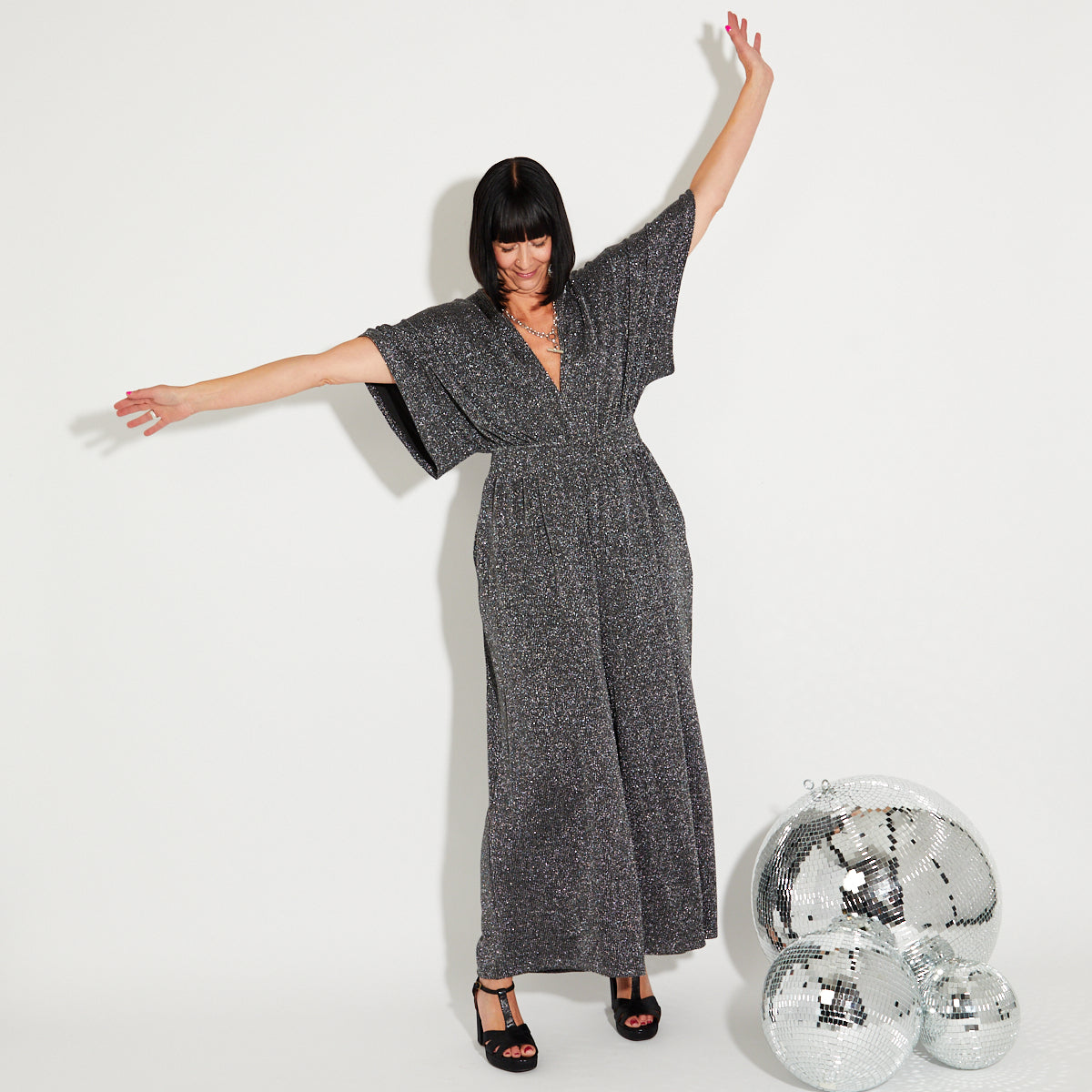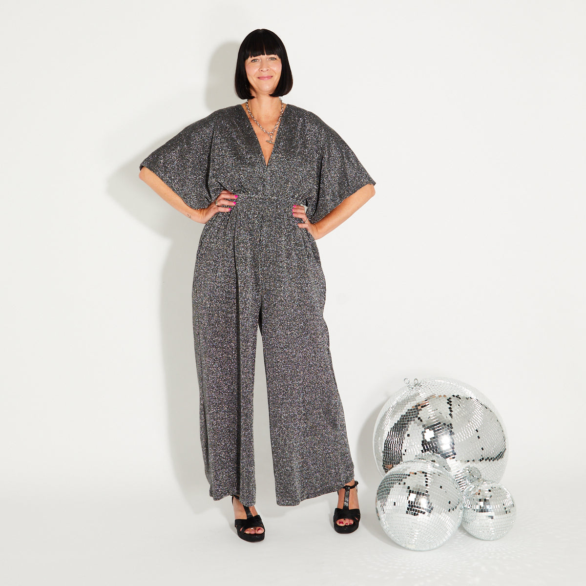 Please note our model, Irene was wearing a larger size for this shoot so please check the size guide for measurements & length of jumpsuit. Due to the studio lighting, the silver sometimes shows up lighter in the photographs.