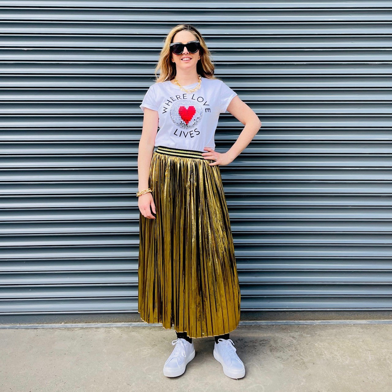 I love a metallic at the best of times, but put it in a pleated skirt and you have a winner. It can be dressed up and down and make a real impact. Absolutely love the fit and the swish