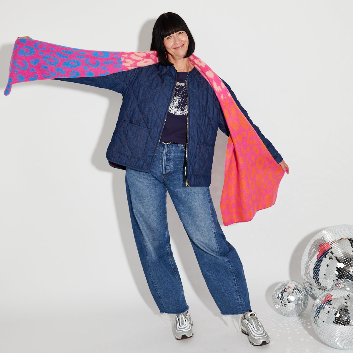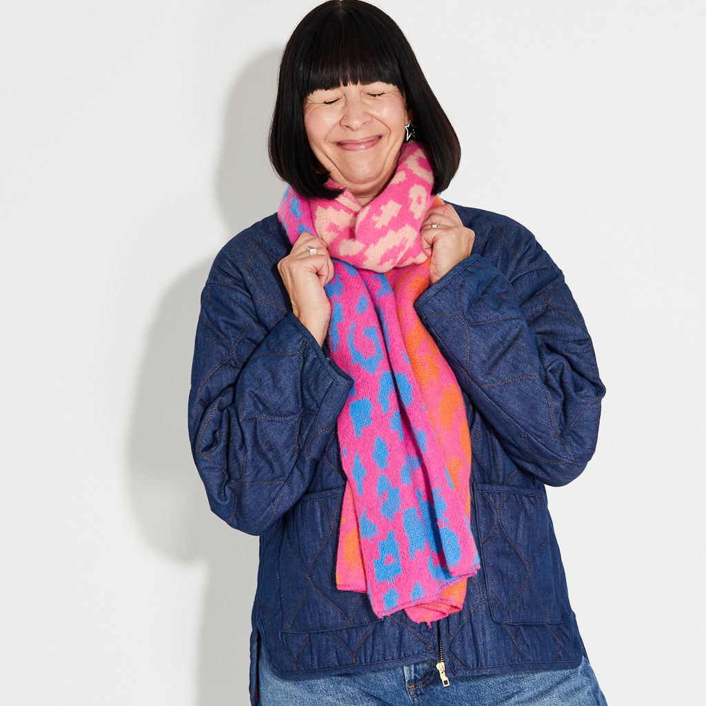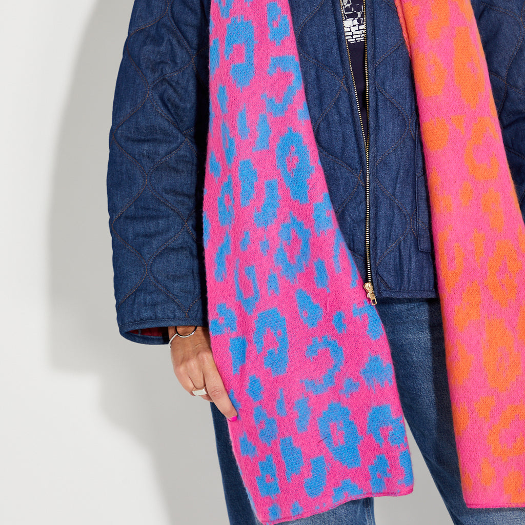 This scarf features a unique combination of a solid background colour and three contrasting leopard prints, arranged in three equal blocks.