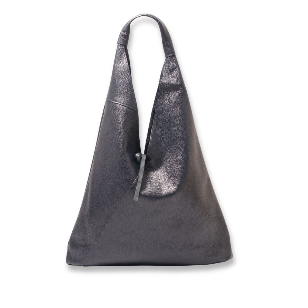 This black leather slouch bag features an open top tie design, an internal zip closure compartment and spacious interior.
