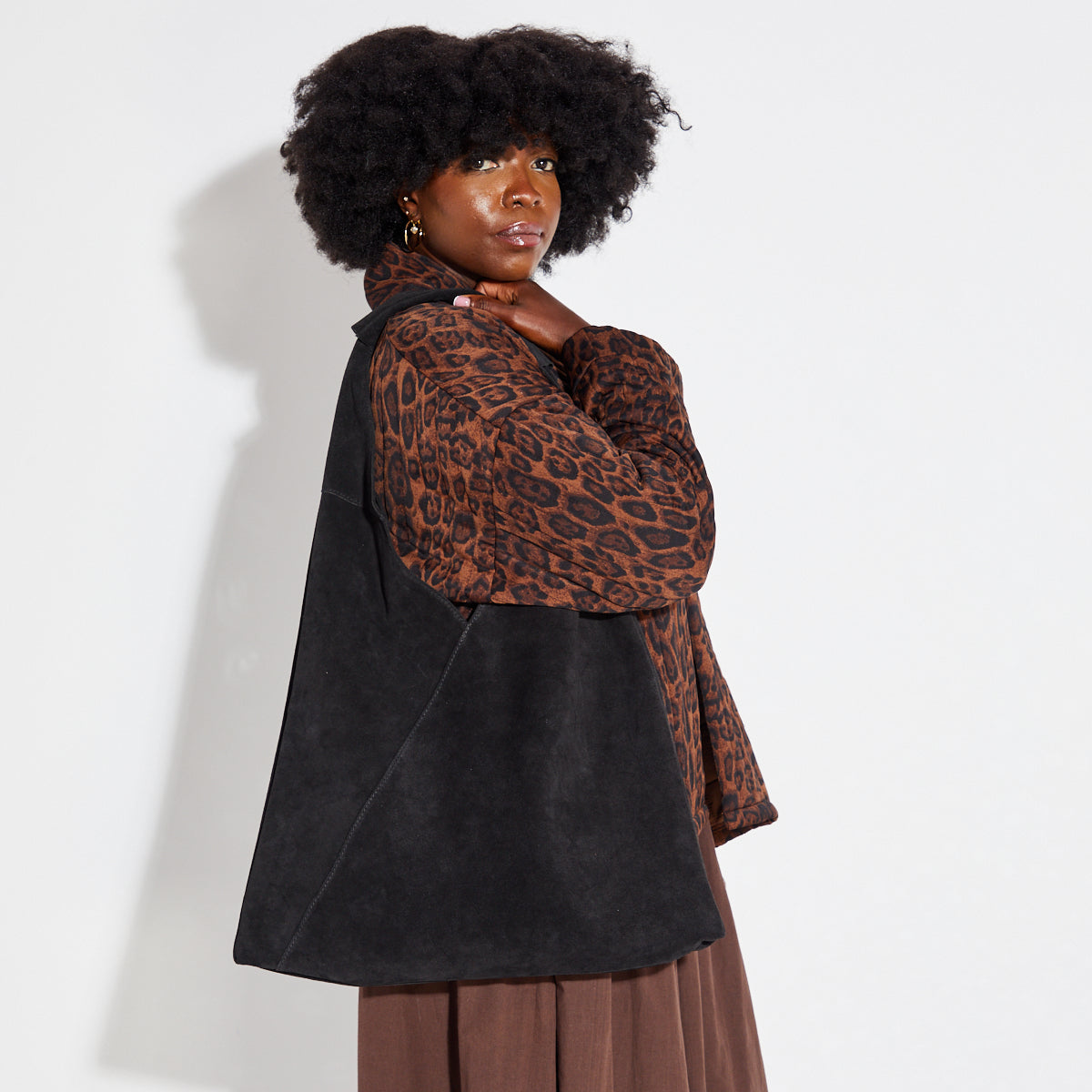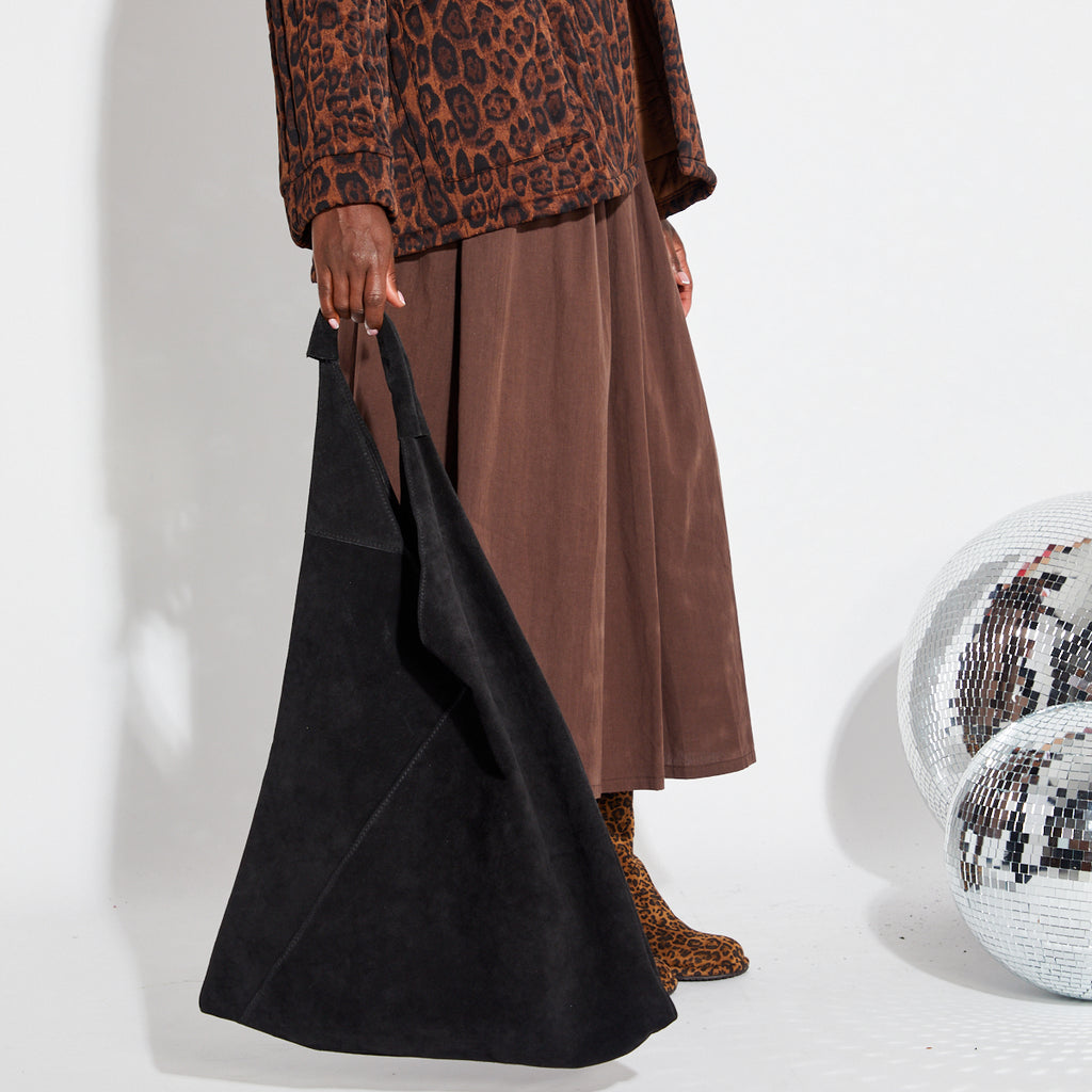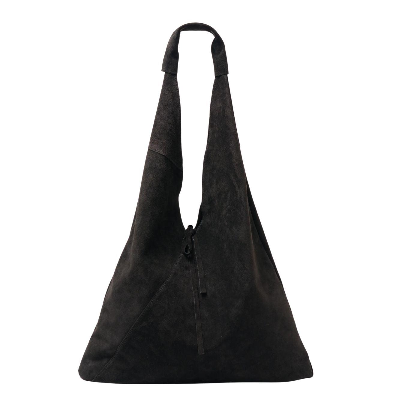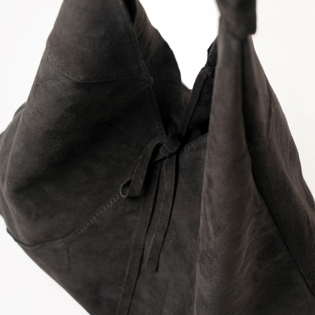 This black suede slouch bag features an open top tie design, an internal zip closure compartment and spacious interior.