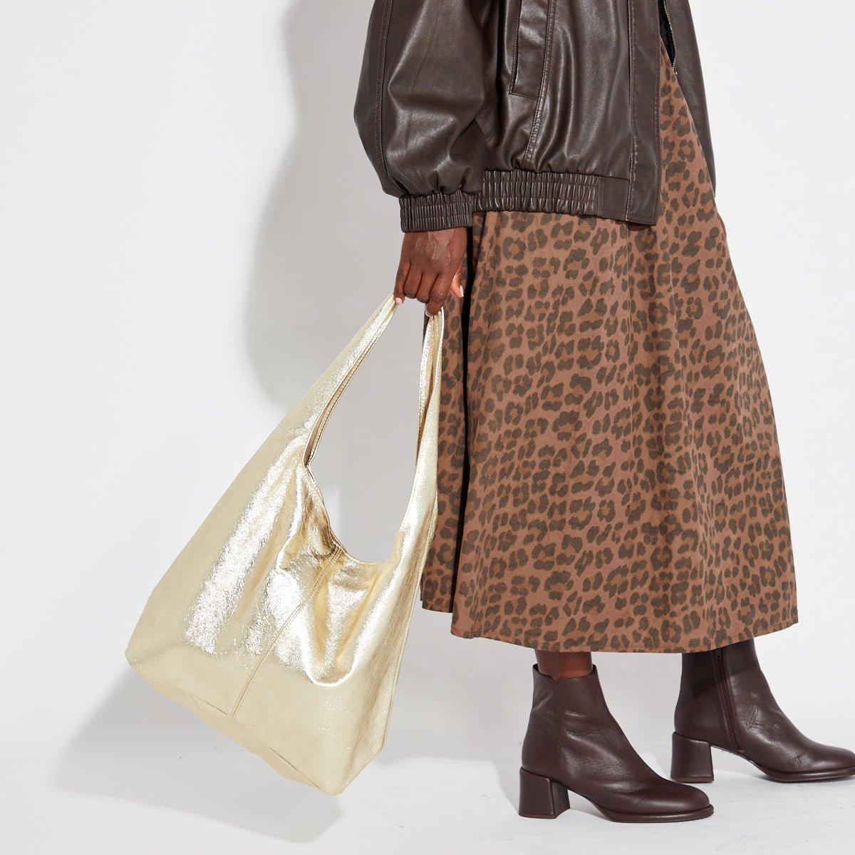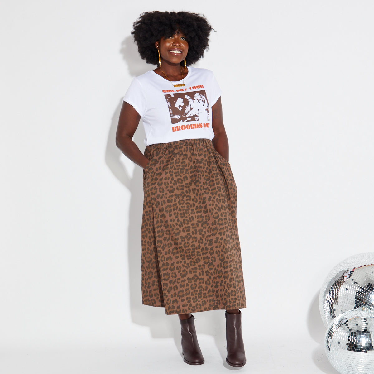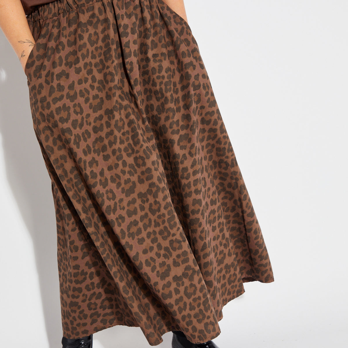 Chocolate brown leopard print A-line skirt. A new colour for autumn from Danish brand Black Colour, featuring an elasticated waistband and pockets!