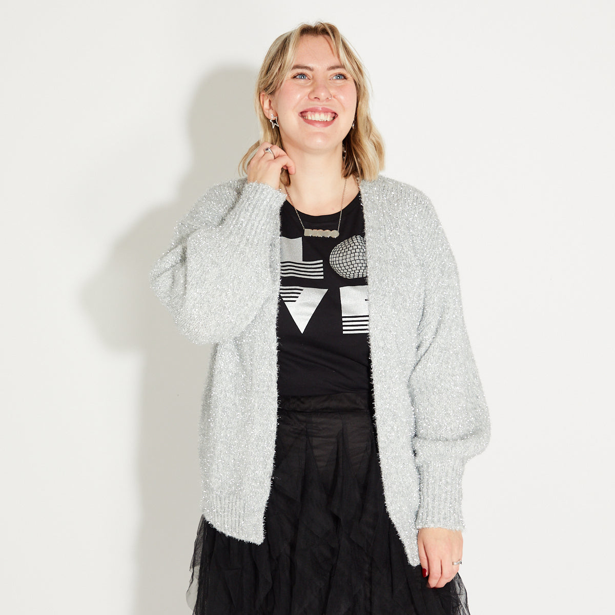 With its slouchy fit and open front, this cardigan is a great layering piece all year round. The soft textured silver flecks running through the wool add a disco twist.
