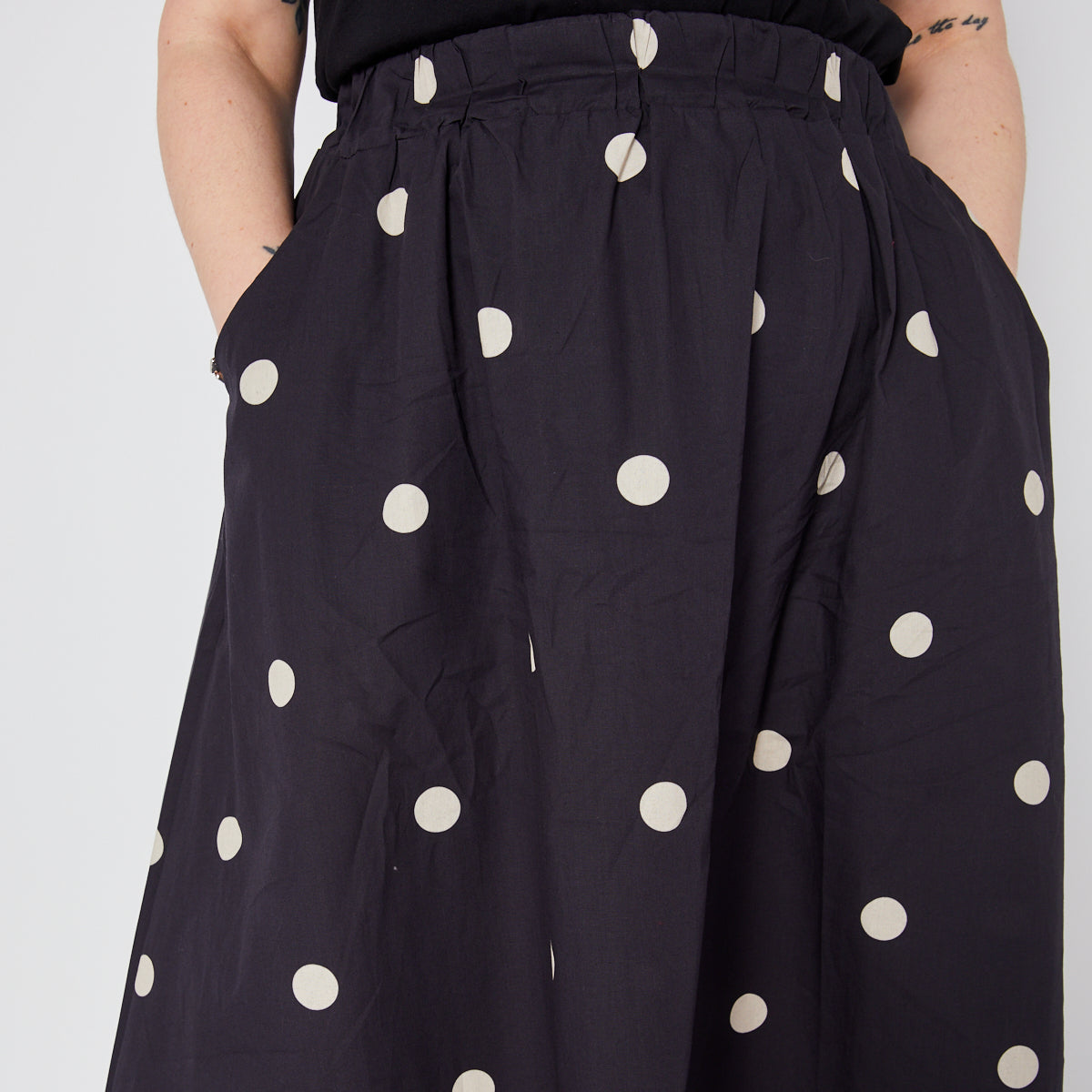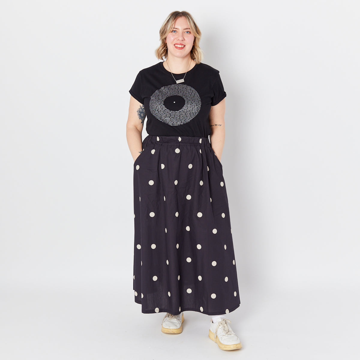 Our black and ivory polka dot unlined skirt in a lightweight cotton is perfect for any occasion. Pair it with boots and a cosy jumper for a daytime look, or dress it up for the evening with your favourite heels.