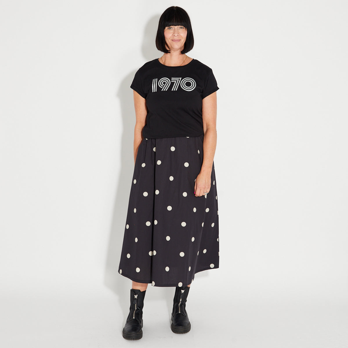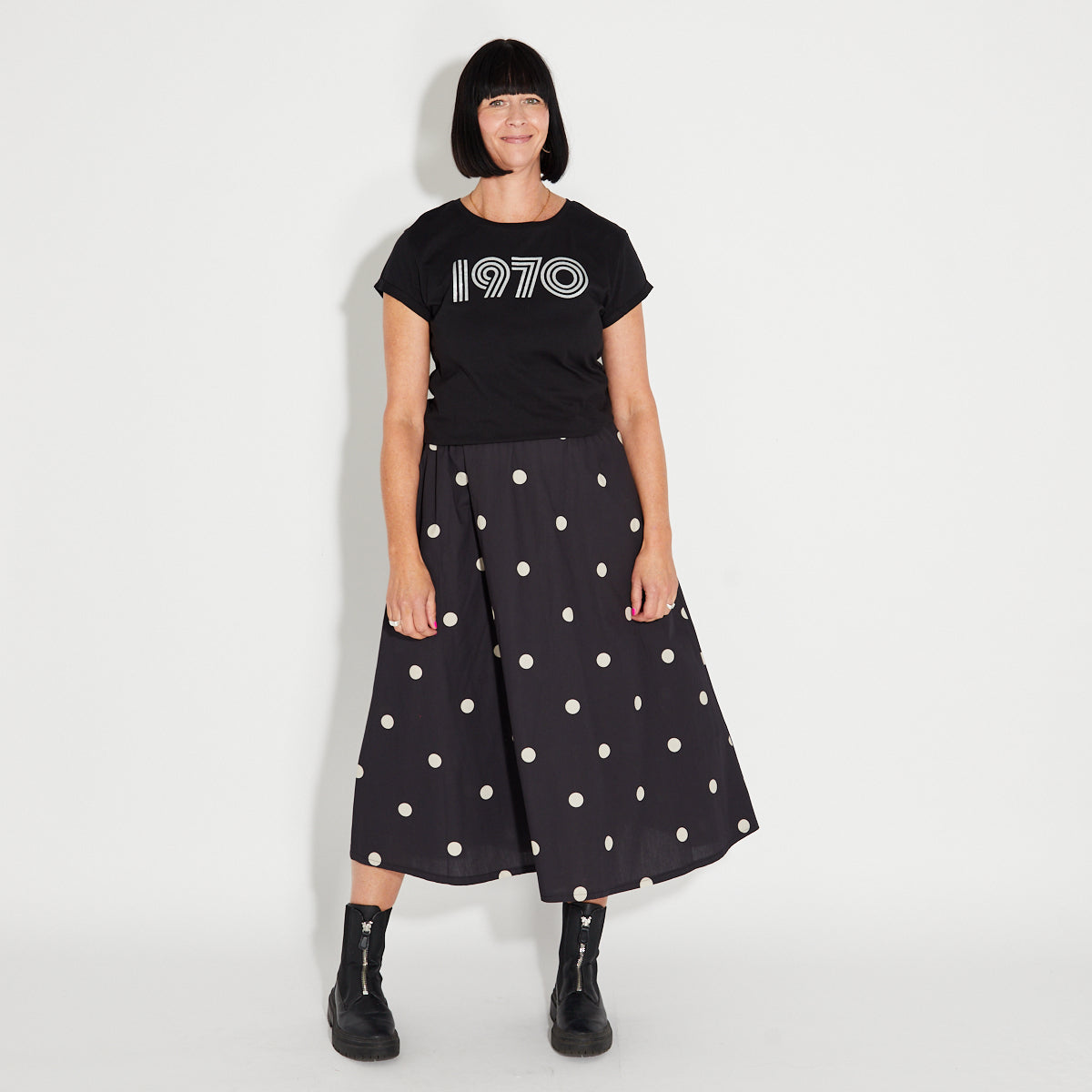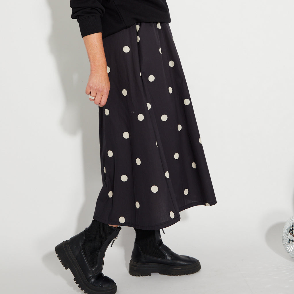 Our new black and ivory polka dot skirt is perfect for any occasion. Pair it with boots and a cozy jumper for a daytime look, or dress it up for the evening with your favourite heels.