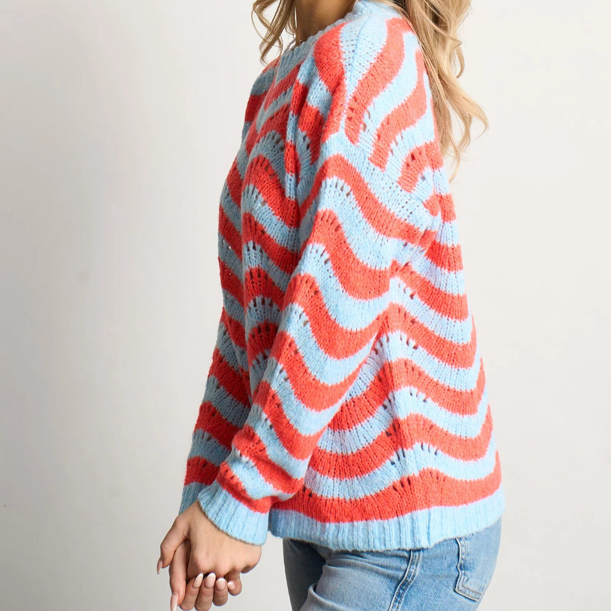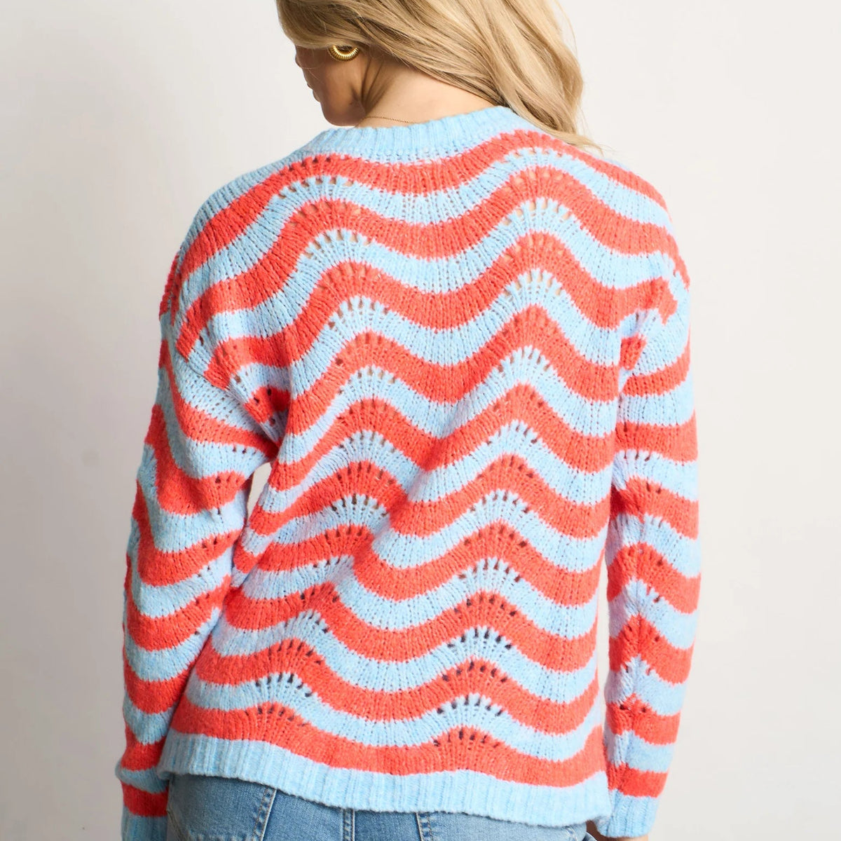 Made from a soft, Italian wool blend this jumper features bold contrasting wavy stripes and an open knit scalloped pattern. Featuring long sleeves and a classic round neck, this piece is designed for comfort.